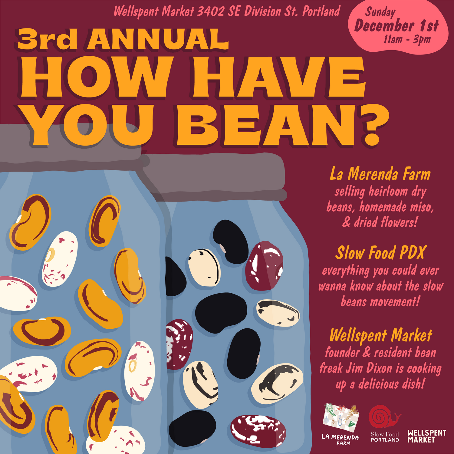 We’re thrilled to welcome back La Merenda Farm and Slow Food PDX for the 3rd Annual celebration of legumes that we call How Have You Bean? Wellspent founder Jim is making a big ol’ pot of beans, Slowfood PDX will be on hand with the low-down on all sorts of legumes, and La Merenda Farm is bringing dried beans, homemade miso, and flowers to sell. Make sure to come on down and learn all about dried beans, chat with the friendly farmers who grow ‘em, grab a bean ‘zine, take home your very own bean seeds, and make general merriment with fellow bean freaks.