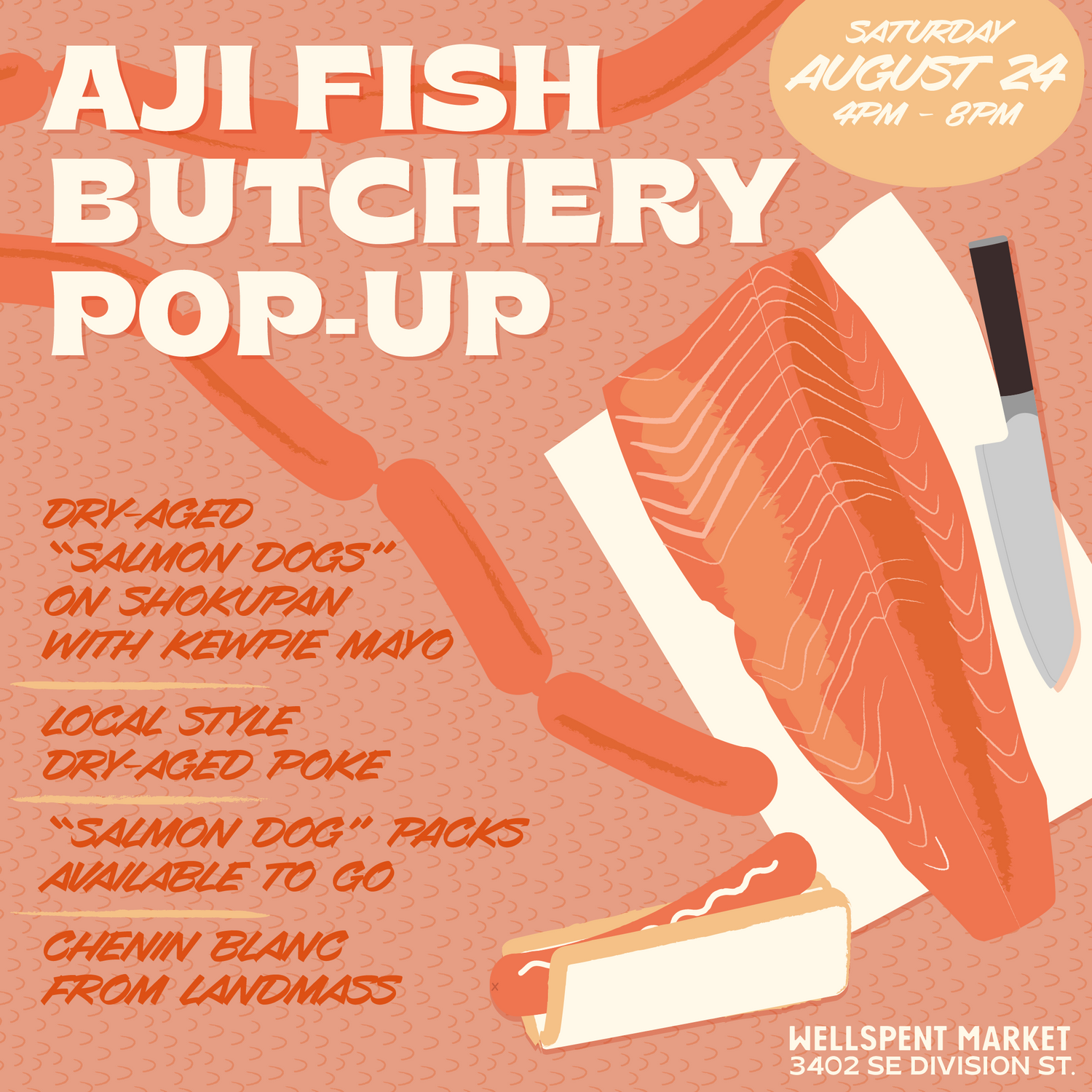 Dry-aged salmon! Salmon poke! Salmon sausages!? This is a pop-up you don’t want to miss: Aji Fish Butchery–AKA chef Jeff Kim’s project dedicated to Japanese-style dry aged salmon–returns to Wellspent for an afternoon of mind-blowing bites unlike any you’ve encountered before. There will be dry-aged salmon filets alongside made-to-order “salmon dogs” (served on shokupan with Kewpie mayo🤯) and deeply flavorful poke, dished up “local-style” without rice (to better highlight the incredibly nuanced flavors of the salmon). With concentrated flavors and a melt-in-your-mouth texture, Chef Jeff Kim’s dry-aged salmon offers Portland a new way to think about (and eat!) the PNW’s favorite fish. See you there!