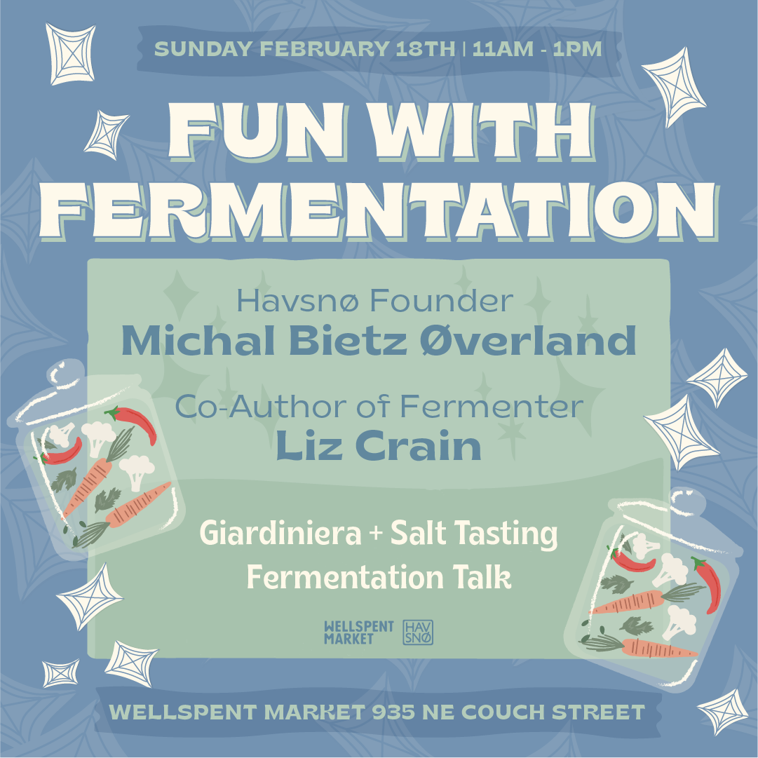 Local writer Liz Crain–co-author with Aaron Adams of the recently released Fermenter cookbook–teams up with Michal Bietz Øverland–founder of Norway’s first commercial saltworks, HAVSNØ–for an in-store event celebrating the transformational power of salt and time. Taste some delicious fermented giardiniera, meet Liz and Michal, get a signed copy of the book, and get salty with us!