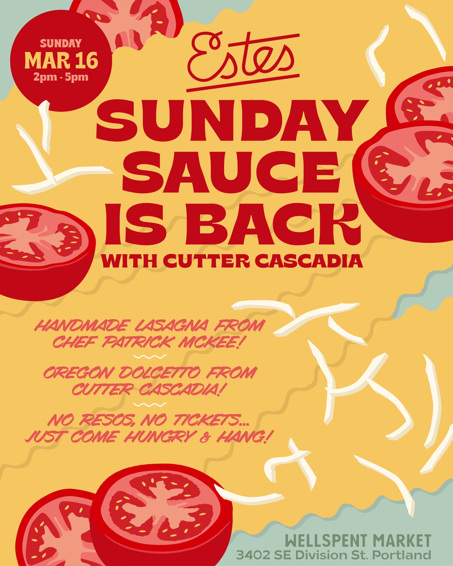 Chef Patrick McKee’s Italian comfort food Estes is bringing Sunday Sauce back to Wellspent, dishing up handmade lasagna alongside expertly selected wines from Michael Garafola of Cutter Cascadia. Cozy up with comfort food, great wine, and good company—it’s the perfect way to close out the weekend!