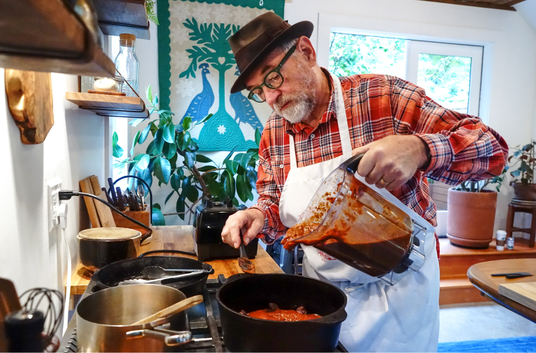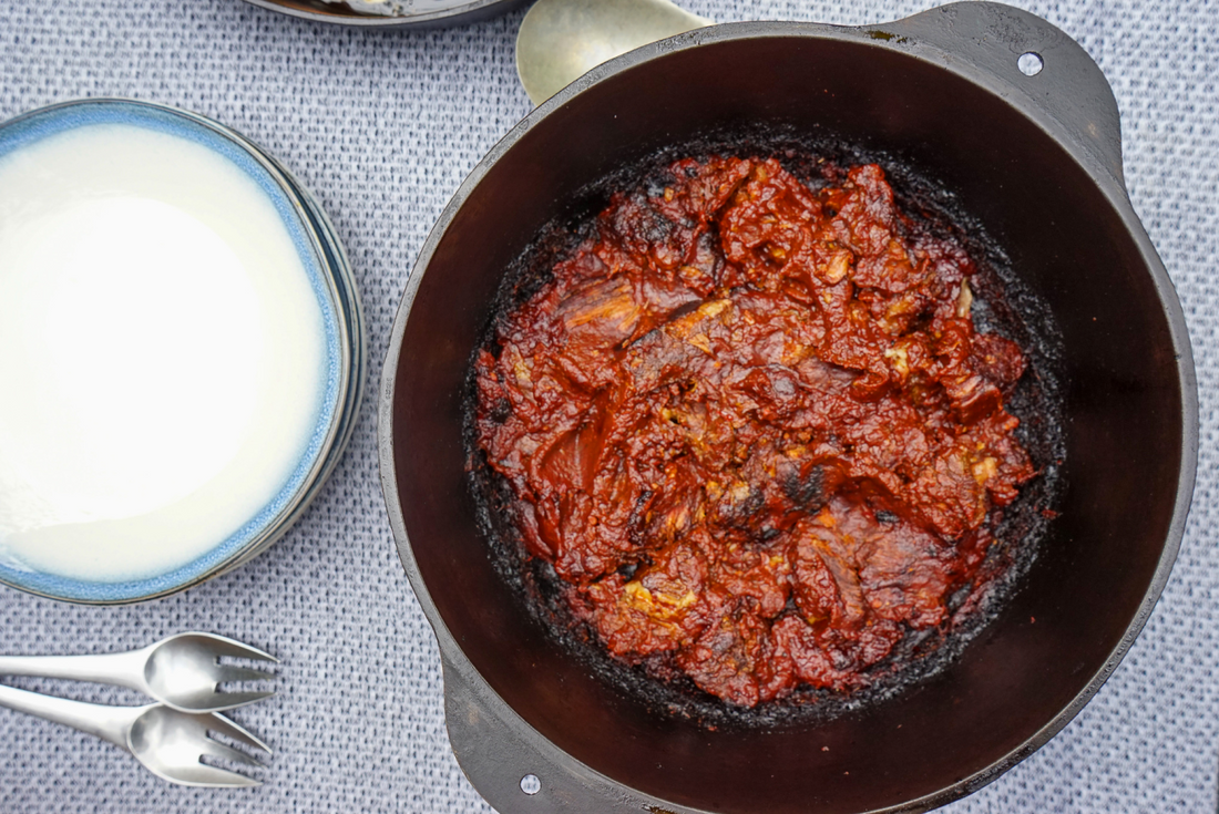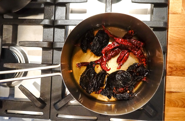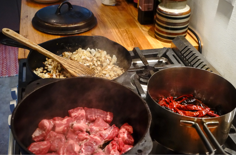 Dried chiles are rehydrated and blended with cooked onion, spices, and tomatoes to make the sauce used to slowly cook chunks of beef.