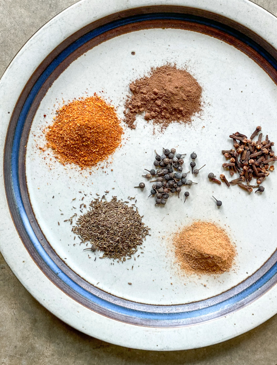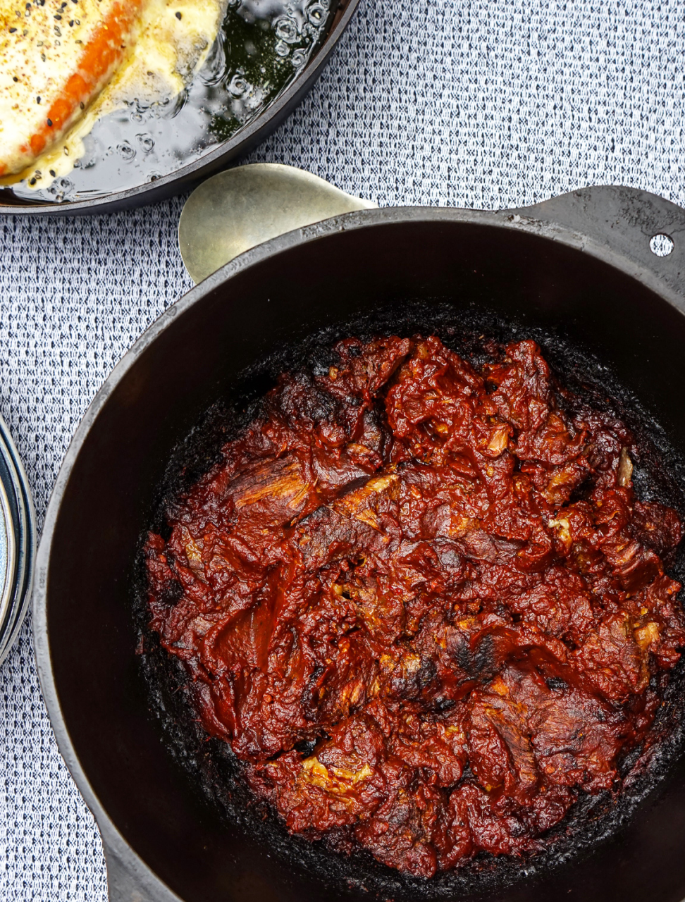 Cook the onion in a splash of olive oil until soft and lightly browned, about 20 minutes. Add the garlic, herbs, spices, and sesame seeds, cook for another minute, then remove from the heat and cool. Most birria recipes don’t brown the meat before braising, but it does add a little flavor, so go for it if you want to.