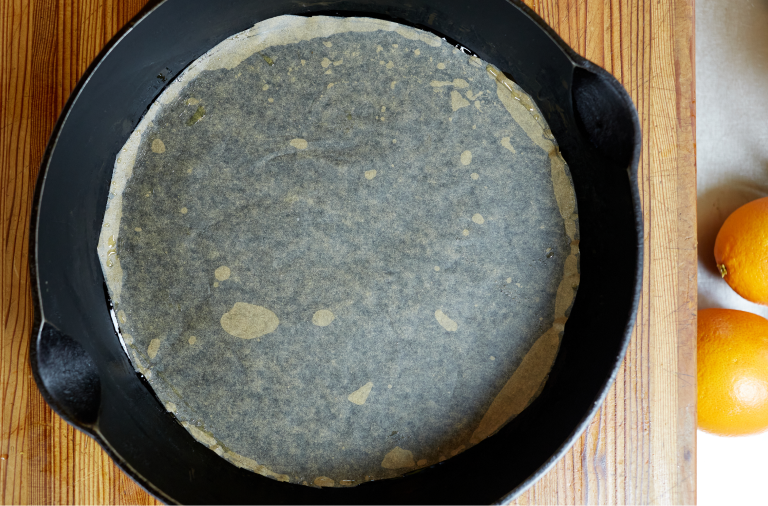 Cut a circle of parchment paper to fit a 9 inch cast iron skillet. Drizzle a little olive oil into the skillet and spread it around and up the sides with the parchment, then straighten the paper into the bottom of the skillet. Or use a 9 inch cake pan with the parchment.