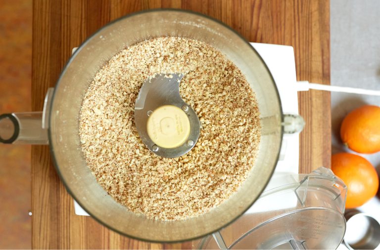 Sicilians also use whole oranges in baking, not surprising since the island produces some form of ripe citrus 10 months of the year. Pan d’arancio, literally orange bread, is a typical quick bread made with a whole, raw orange and usually baked in loaf pans. It’s typically eaten as a snack with an afternoon coffee. I adapted a version from writer Domenica Marchetti, using extra virgin olive oil instead of butter and increasing the amount of almonds. And instead of using almond flour, I ground the nuts in the food processor. The result is coarser than flour, more like a fine meal, but it adds a lovely texture to the cake.