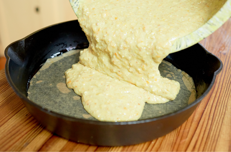 Add the wet ingredients to the flour mixture and blend together. Pour the mixture into the prepared skillet. Bake for 45 minutes or until the top is golden brown and the cake is pulling away from the sides of the skillet.