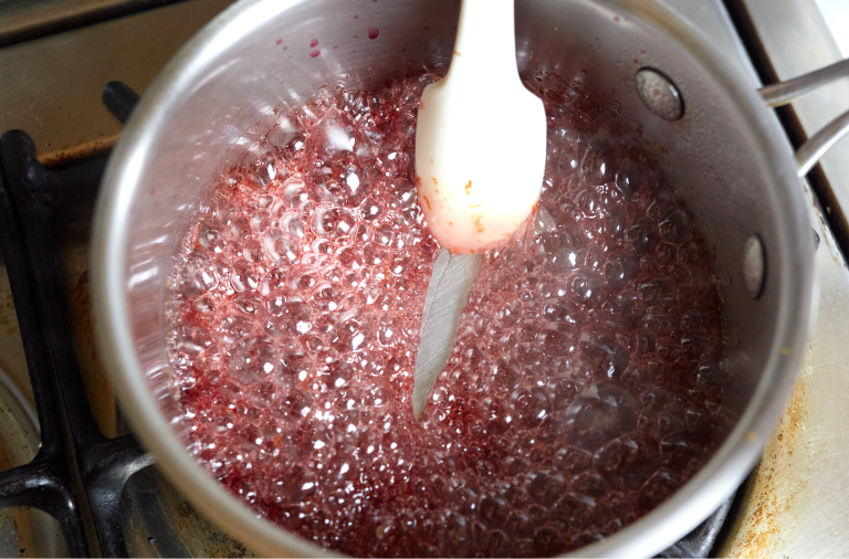 As the cake cools in the skillet, make the glaze by zesting 1 orange, squeezing out the juice, and combining both with 1/3 cup sugar in a small saucepan. Heat gently to a boil, let it bubble for 2-3 minutes or until it forms a light syrup (drag a spoon through it to create a trough, and if it takes a second for the liquid to flow back together, it’s ready). The syrup will thicken as it cools, but a few seconds back on the burner will make it runny enough to brush on the cake.