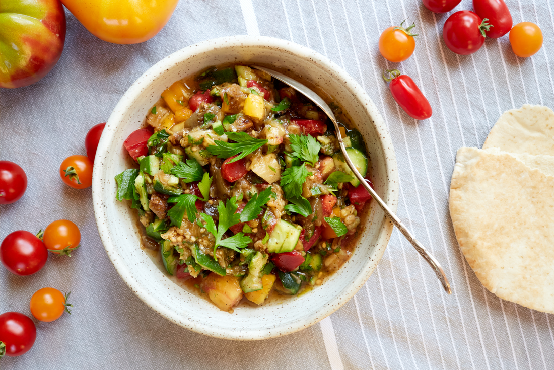 Burnt eggplant is great for salads, too. Chopped finely and mixed with tomatoes, parsley, and, with a nod to the Lebanese version, cucumbers, the eggplant gives the dish a silky texture and picks up the flavors of the other ingredients. And while it’s technically a salad, it’s ok to scoop it up with pita bread just like a dip. It’s best at room temperature.