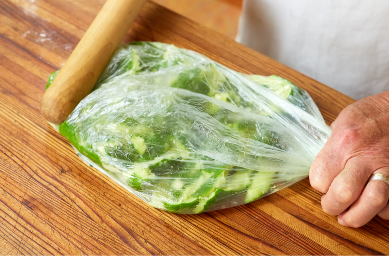 Trim the stems from the cucumbers, place in a plastic bag, and smash with a rolling pin, kitchen mallet, empty wine bottle, or similar heavy object. Pour onto a cutting board and chop into bite-sized pieces.