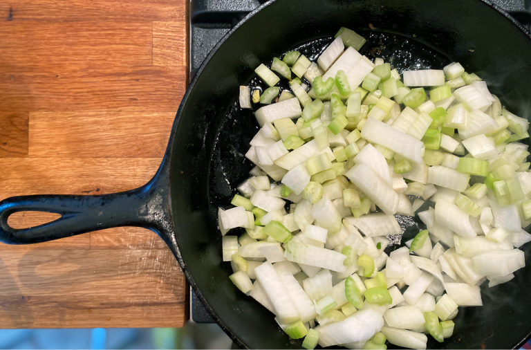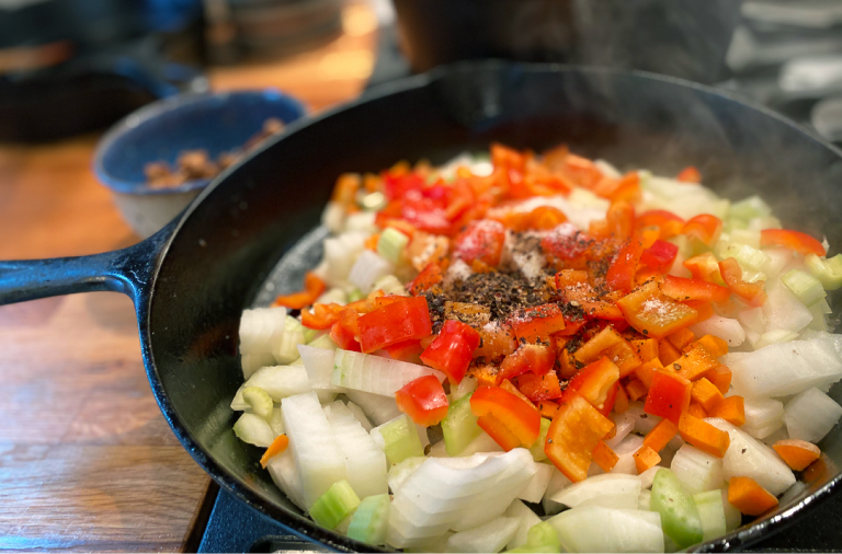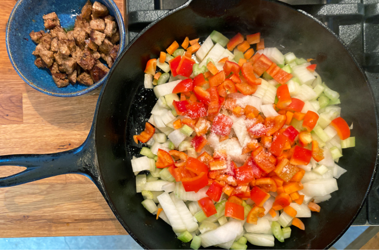 Use the same pan and fat to cook the onion with salt until well-browned, add the thyme, pepper, and the rest of the vegetables, and cook until soft.