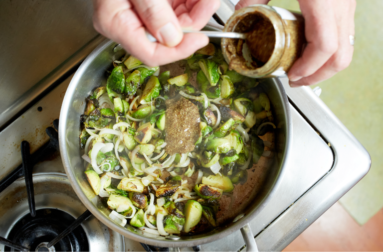 We all came with a pair of genes with the roll-off-the-tongue name of TAS2R38, and it provides the code to our bitter flavor receptors. Some copies of the gene make you taste the bitter, some don’t, and if your DNA includes two of the bitter-tasting versions, you probably hate Brussels sprouts. I used to tell people that these Brussels sprouts, caramelized to a dark brown, mellowed with onion, and flavored with mustard, would convert anyone, but I may be wrong about the supertasters.