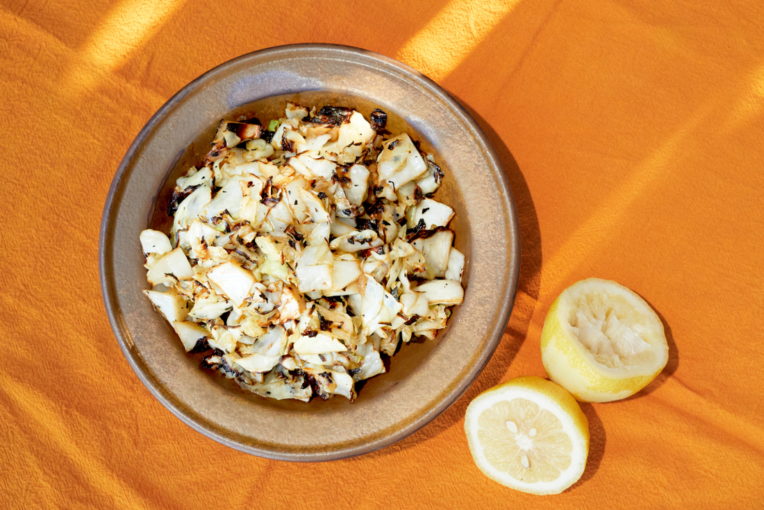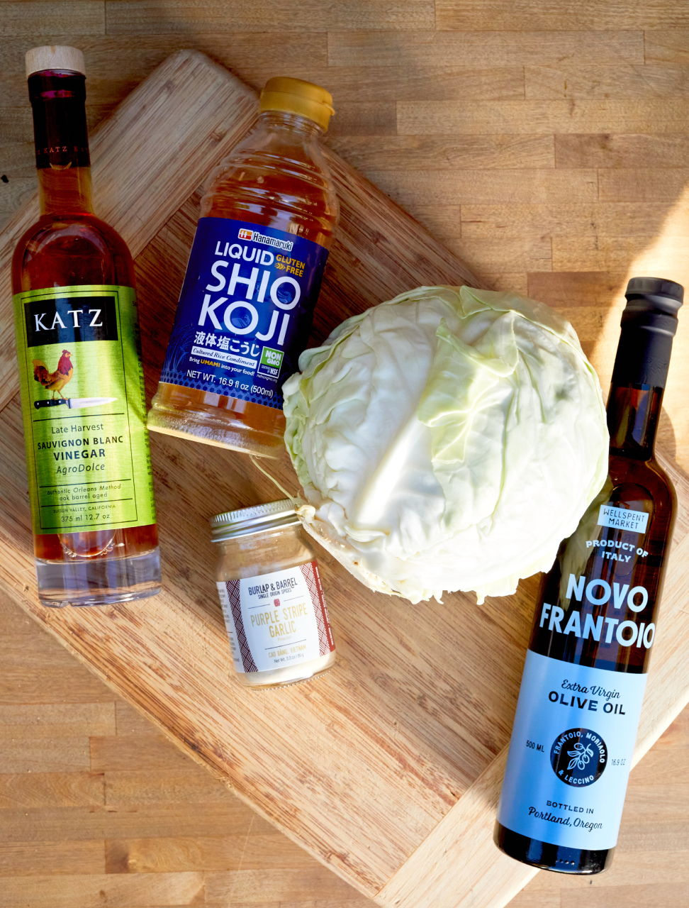 Add cabbage and 1-2 tablespoons vinegar, 1 tablespoon shio koji, 2 tablespoons olive oil, and 1 tablespoon garlic powder to a large mixing bowl and toss with tongs. Taste and add sea salt flakes and lemon juice as needed.
