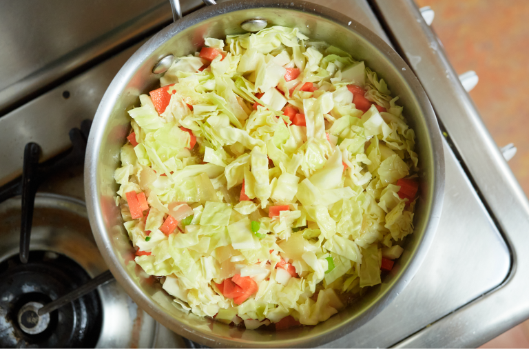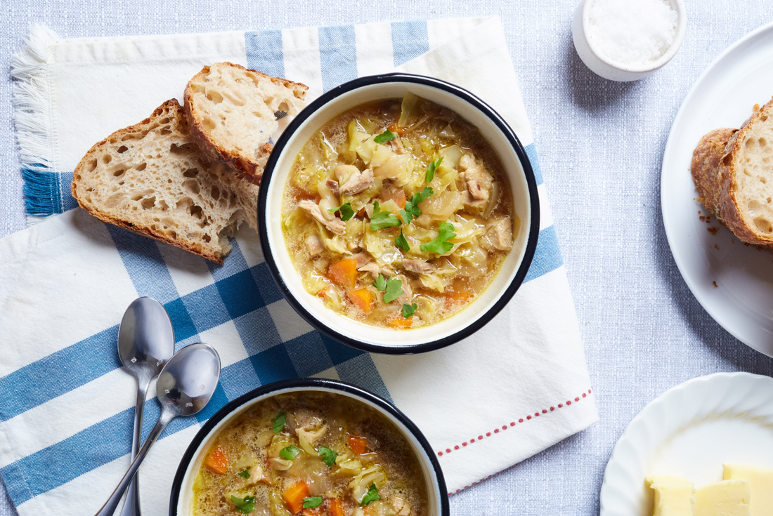 Add the cooked onions, carrots, and cabbage to the soup, and stir in 2 tablespoons soy sauce, 1 teaspoon thyme, and 1/2 teaspoon garlic powder. Simmer the soup covered for at least 45 minutes, stirring occasionally. Taste and add salt as needed. Remove from the heat and stir in the vinegar.