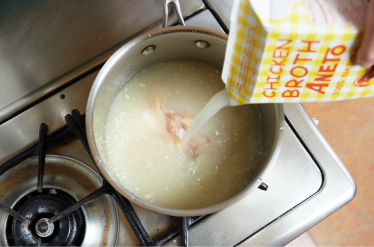 Put the chicken and broth in a 4-6 qt stockpot, bring to a boil, reduce heat, and simmer for 30 minutes. Remove the chicken, let cool, pull off the skin, pick the meat from the bones, and tear or chop into into bite-sized pieces. Return the chopped chicken to the pot with the broth.