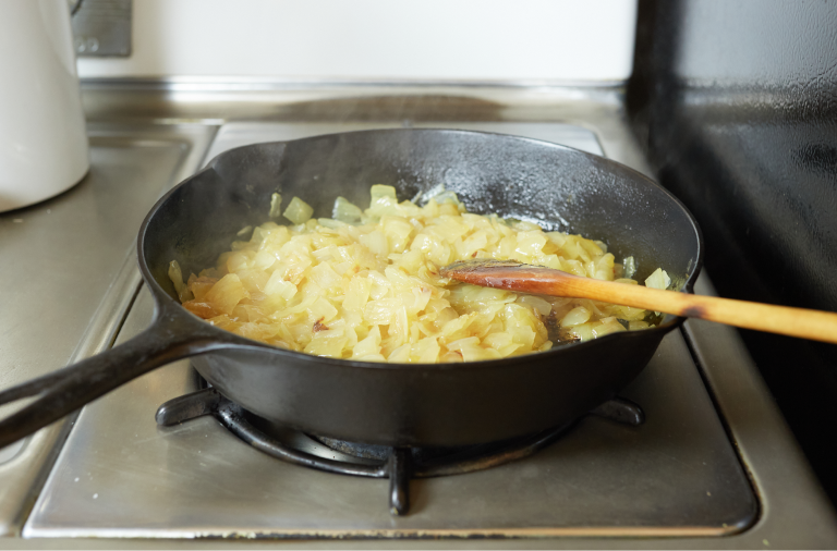 While the chicken simmers, cook the onions in 3 tablespoons olive oil with 1 teaspoon salt over medium-low heat until dark and caramelized, 45-60 minutes. Stir occasionally, and if the onions start to burn, add a few tablespoons of water. Add the celery for the final 10 minutes of cooking.
