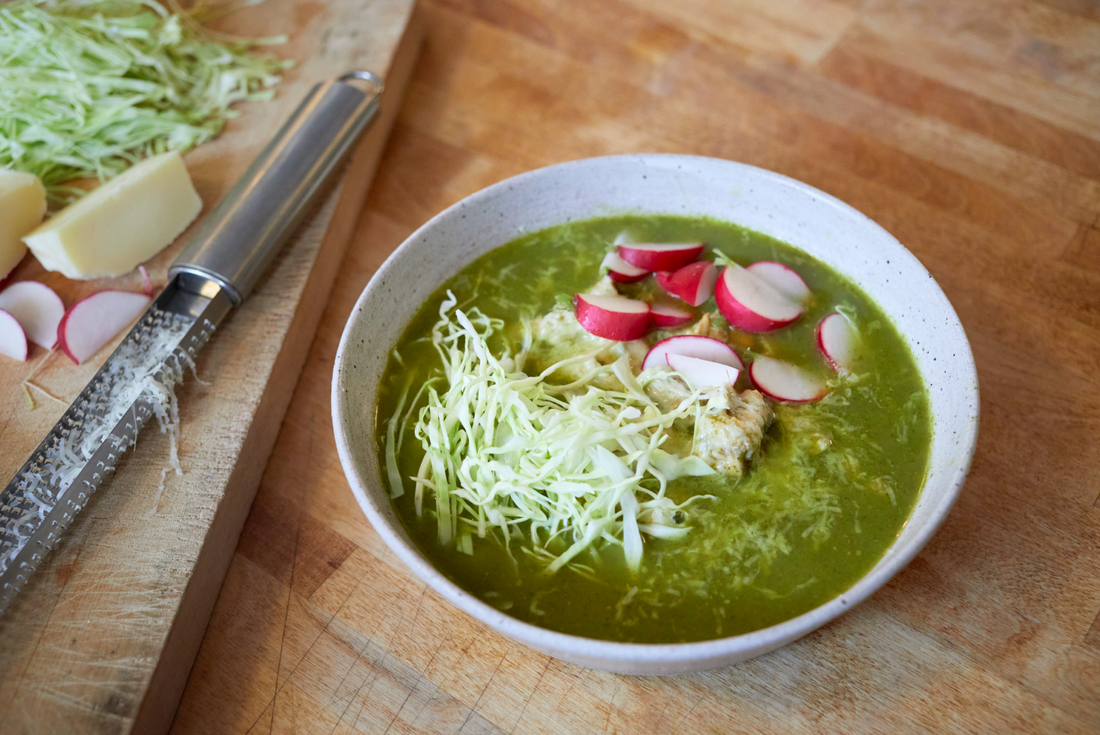 This is also how we get to Hominy: after the Nixtamalization process, instead of washing and milling the maize into masa, it is cooked in whole kernel form until it softens a bit, while still maintaining a nice bite. Hominy is usually served in a soup called Pozole which comes in many different styles. There’s Pozloe Rojo, which typically comprises stewed pork shoulder or shank braised in a broth of red chilis. This version has a lot of depth and spiciness that pairs well with the fatty unctuousness of pork. There’s also Pozole Blanco, a clean, clear chicken broth with hominy and picked chicken. Finally, there is Pozole Verde (which is what my recipe is woot!): jalapeno, tomatillo, garlic and onion are cooked in chicken stock until they are soft, then pureed with cilantro before being added back into the broth with hominy and shredded chicken. This version is bright and acidic from the tomatillo with underlying heat from the jalapeno and earthiness from the cilantro.