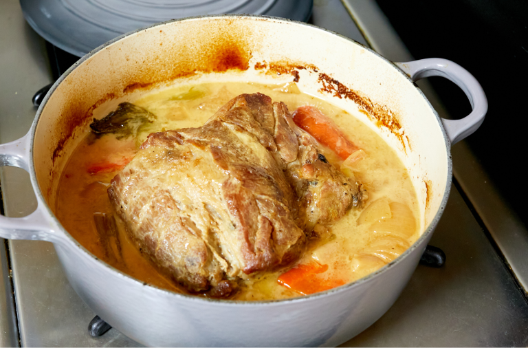 Check every 30-45 minutes, adjusting heat to keep liquid at a gentle simmer and adding more cider if needed to keep the liquid level up at about ½ the thickness of the pork. After 2 ½ hours, check to see if the pork is tender enough to pull apart with a fork. If so, remove from the oven and let rest overnight if possible. Remove the vegetables and, if desired, chop finely and return to the pot. Reheat in the oven at 350 for about 30 minutes or on the stovetop over low heat until warmed through.