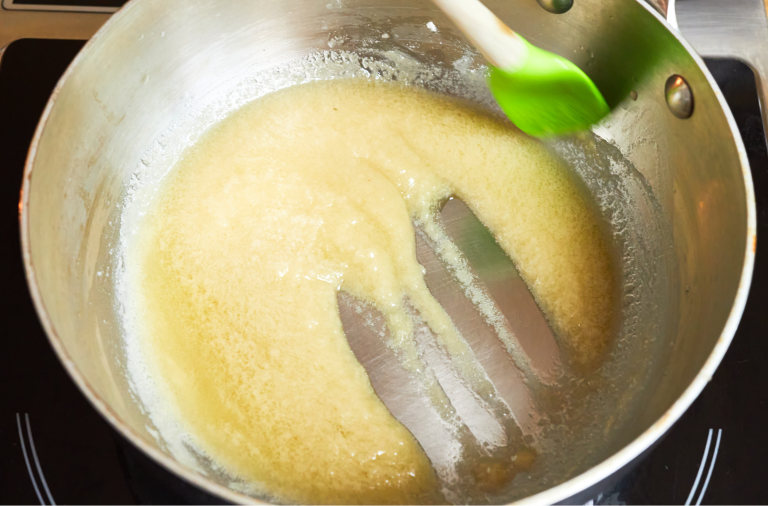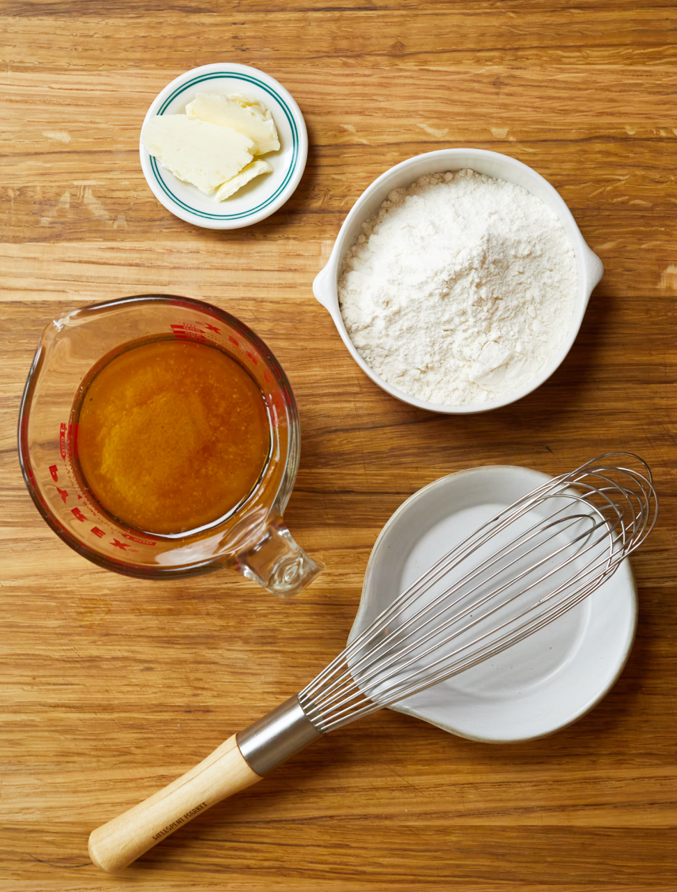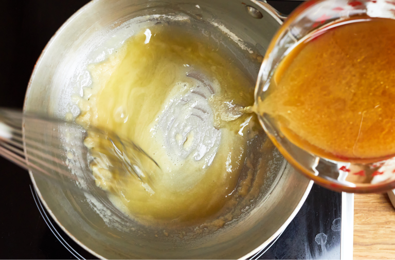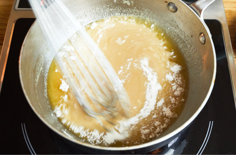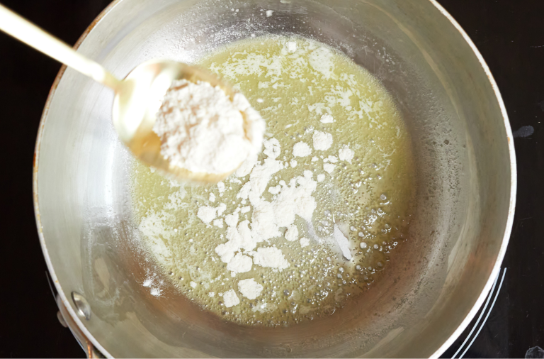 Melt butter in a medium hot pan, wait for it to barely brown, then sprinkle a spoonful of flour while whisking to combine.
