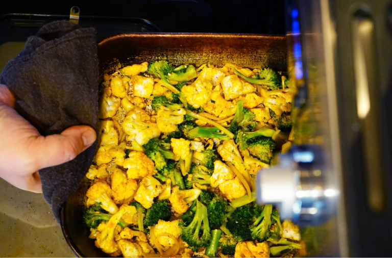 Chop the broccoli and cauliflower into bite-sized pieces, toss with a tablespoon or two of the olive oil, 1/2 teaspoon of ground ginger, 1 1/2 teaspoons of turmeric, and a good pinch of salt. Roast in the oven at 425F for about 6 minutes, then rotate the baking sheet and roast another 5 minutes. They’ll still be firm but will cook more in the curry.