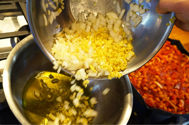 Add 3 cups of cooked chickpeas and cook until lightly browned. Add the 4 finely chopped garlic cloves and cook for another minute or so.