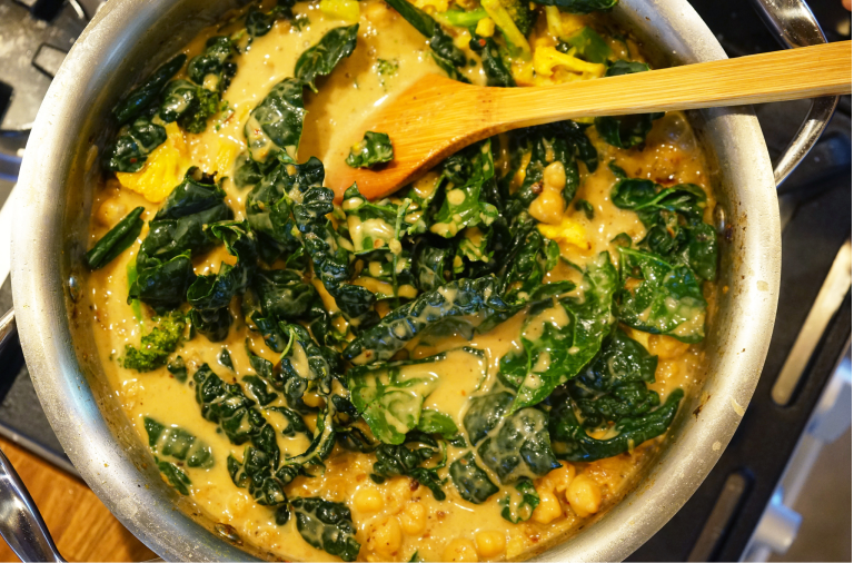 Aromatic vegetables and spices are cooked in olive oil to bring out flavor. The beans, greens, coconut milk, and broth go in next, and finally some roasted vegetables bulk it up with more flavor and texture."