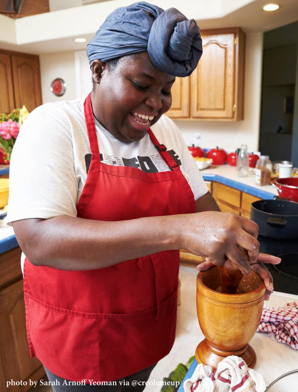 teacher, writer, and entrepreneur Elsy Dinvil grew up in the kitchen, spending countless hours at her mother’s side chopping and crushing the ingredients for epis, Haiti’s ubiquitous all-purpose marinade. She came to the US in the early 90’s to study Food Science Technology, then spent a career working in humanitarian aid and international development. In 2017, after a protracted years-long bout with digestive issues and surgeries, Elsy founded Creole Me Up in an effort to help people overcome health issues by creating nutritious, allergen- and chemical-free foods based on her mother’s traditional recipes.