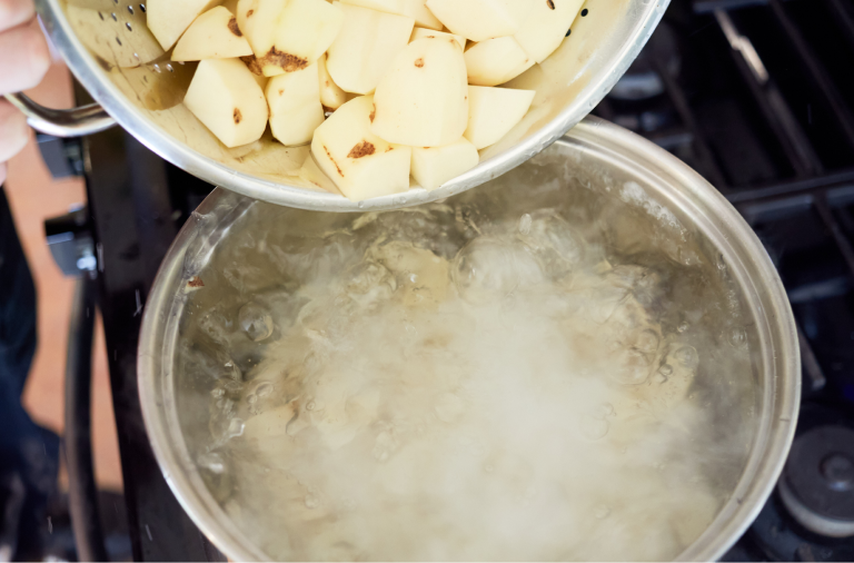 Bring a large pot of water to a boil; add 2 tablespoons Kosher salt, 1/2 teaspoon baking soda, and the cut up potatoes. Return the water to a boil, reduce to a simmer, and cook until the potatoes are tender (about 10-15 minutes).