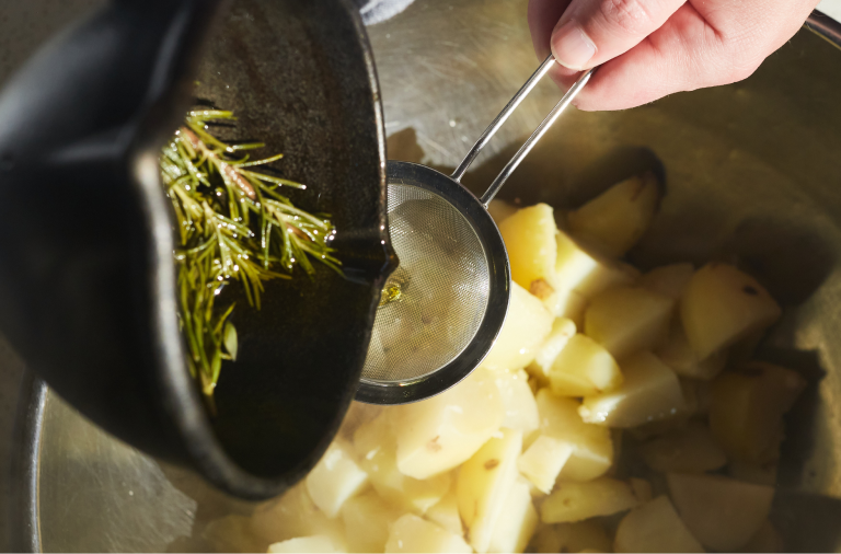 When the potatoes are done, drain and rest for 30 seconds, allowing excess moisture to evaporate. Add the potatoes to the bowl with the infused oil & duck fat mixture, season to taste with salt and pepper, and toss vigorously until a layer of “mashed” potatoes covers all the potato chunks.