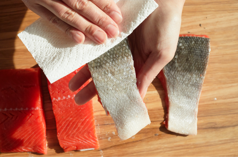 To help the skin dry out, pat the salmon dry and place it in the refrigerator uncovered, skin side up, for at least an hour (more hours equals crispier skin).
