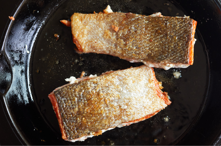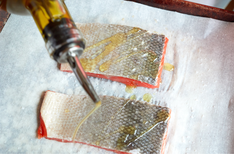 Remove from the fridge and salt both sides of the fish; drizzle the olive oil in the skillet. Place the fish skin side down in the pan and then turn on the heat to medium-high. It is essential that the pan and fish start out cold together.