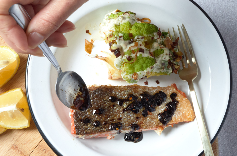 Voila! Plate the salmon and spoon the pan sauce over the top. Serve with your favorite side dish… it’s great with a hearty risotto and green salad, but in this iteration we enjoyed it with our Whole Roasted Romanesco.