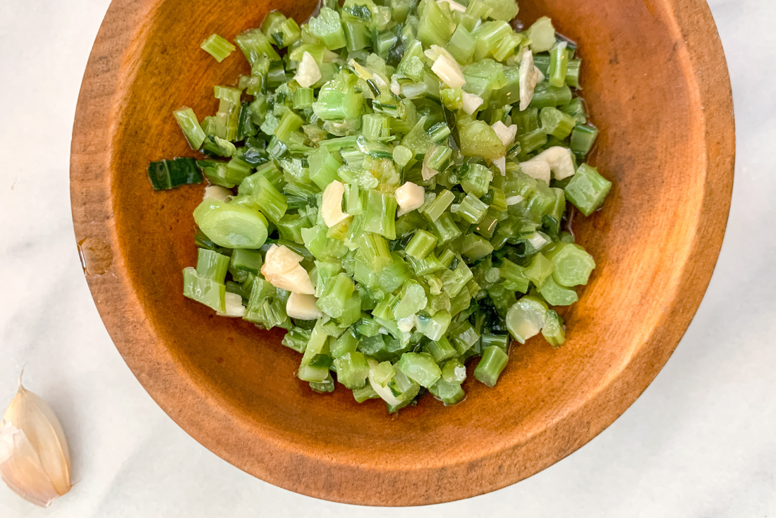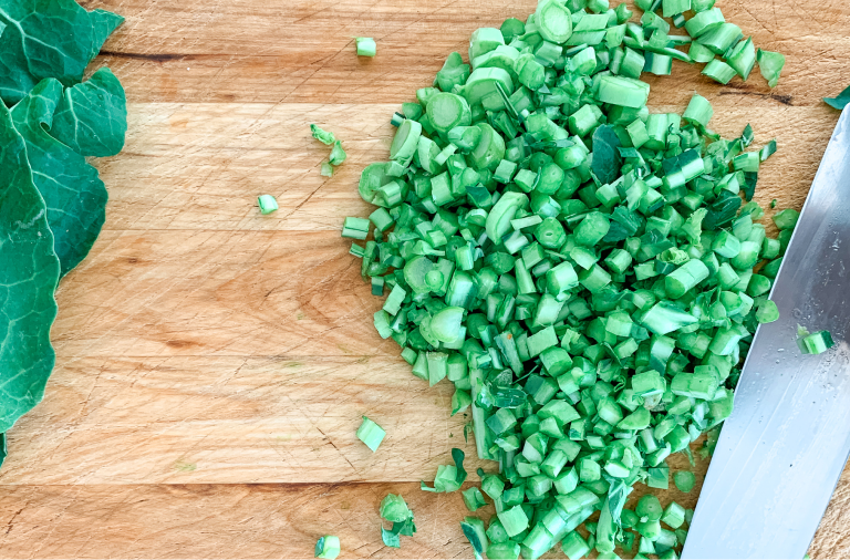 Slice the stems thinly, 1/4 inch or less. A bunch of collards or kale will provide about a cup of chopped stems.
