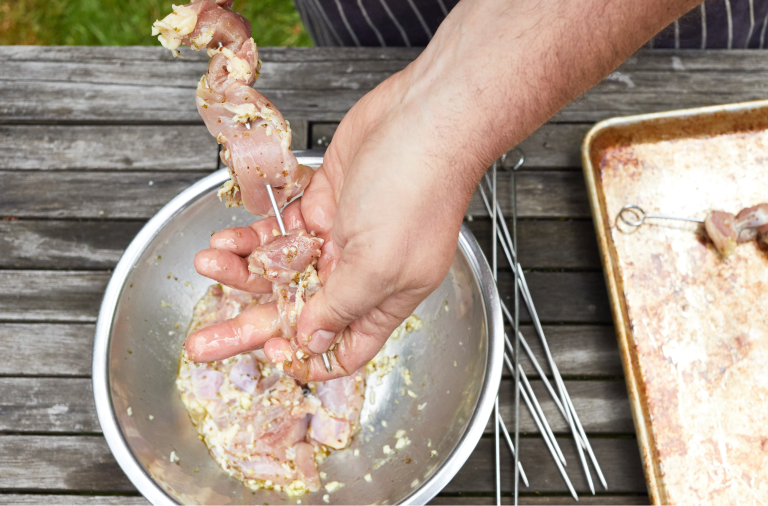 - * How you do this is up to you. We prefer to cut the chicken into pieces about 1 1/2” wide by 3” long, and then run the skewer through them at 2 points on either end in a kind of “ribbon” formation, but we’ve found that 1” cubes skewered straight through work great too.
