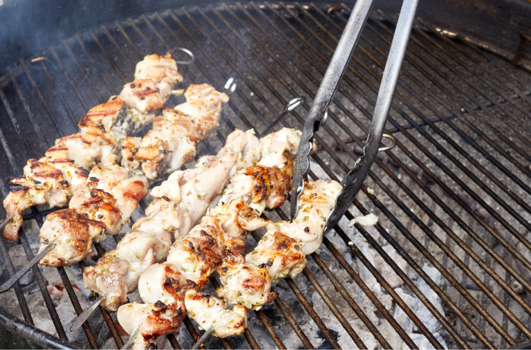 Put the chicken on the skewers, taking care not to crowd them too much, and grill over rippin’ hot coals (or the high side of medium high if using a gas grill) for 3-4 minutes on each surface - top, bottom, and both sides. As all skewers are different, they will likely all take slightly different times to come to doneness. You’re looking for a good bit of char and a firm texture.
