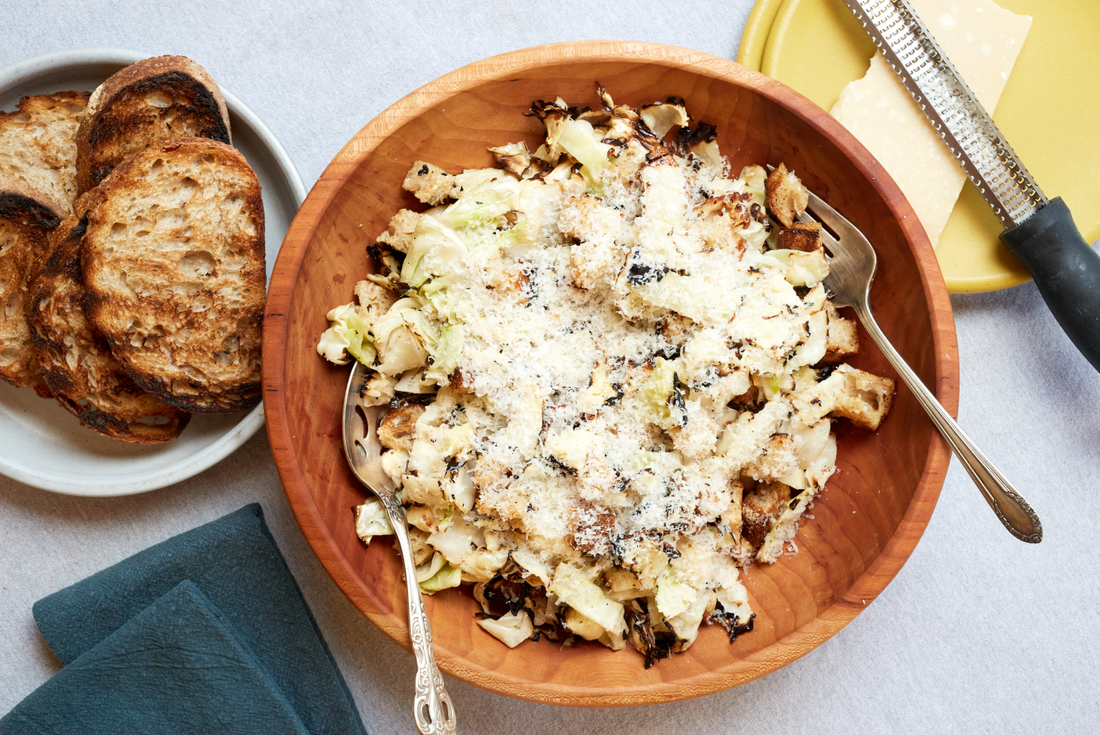 and this simple but impressive salad provides yet another reason why it should be yours, too. Cut into wedges and grilled, it softens but retains a little crunch (if you’re not grilling you can roast the wedges in the oven). And while I like to chop the grilled cabbage into more manageable pieces, serving them intact drizzled with the creamy dressing, draped with anchovies, and dotted with crispy croutons makes the salad imminently instagrammable.