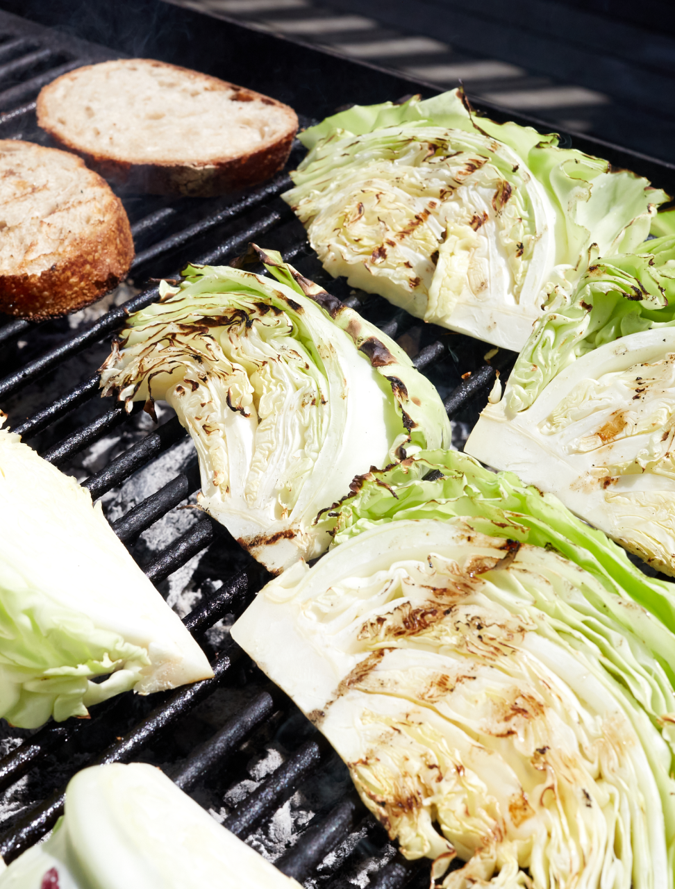 Cut the cabbage into 4 wedges, keeping the core intact so they hold together. Set them on your grill directly over the coals and cook until nicely browned, about 5 minutes per side. (Or lay them on a lightly oiled sheet pan and roast at 400F for about 20 minutes, turning them over after 10 minutes.) Remove from the grill and chop coarsely (chop the core, too, but into smaller bites).