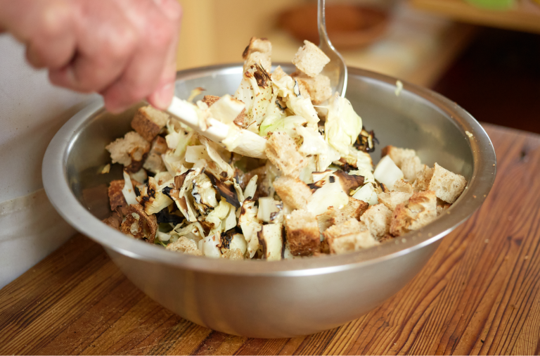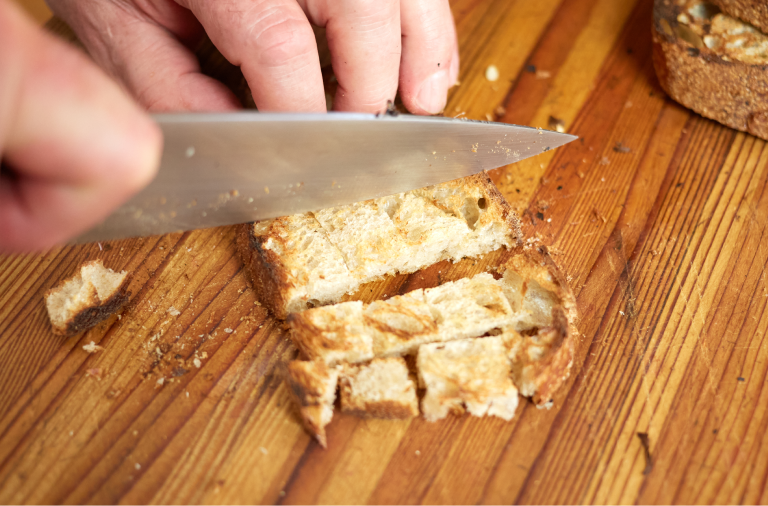 Grill the bread until browned on both sides. Remove from the grill, cut into bite-sized pieces, and toss with 1 tablespoon of olive oil.