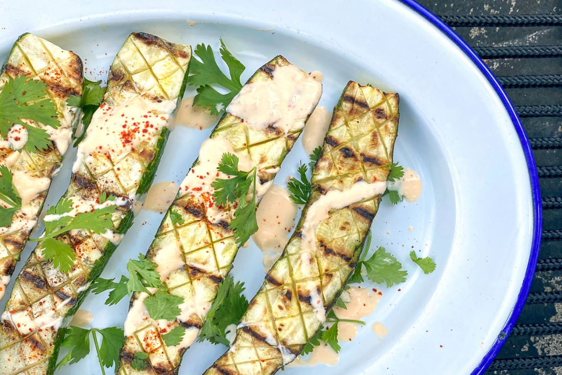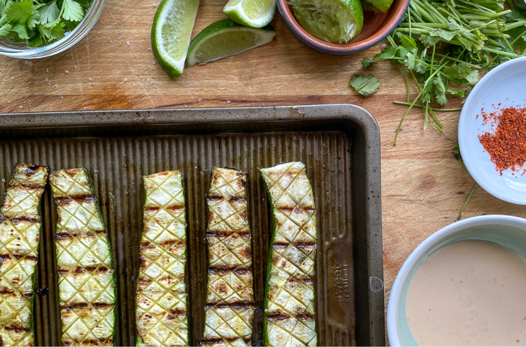 Self-described as a “huge nerd,” Hutch brings his analytical skills to the kitchen with well-thought-out recipes that bring lots of flavor to simple foods. We’ve adapted his recipe a bit for the summer, grilling the zucchini instead of frying it and adding our favorite spicy red pepper as an option.