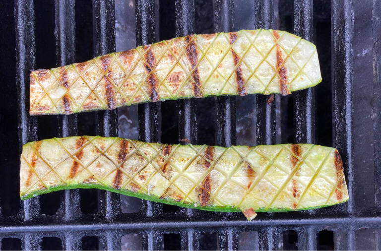 Grill over direct heat until lightly browned on both sides. If you don’t have a grill, cook the zucchini in batches in a hot skillet with a little olive oil, cut-side down for 3-5 minutes, then flip and cook another minute or so. Transfer the cooked squash to a platter.