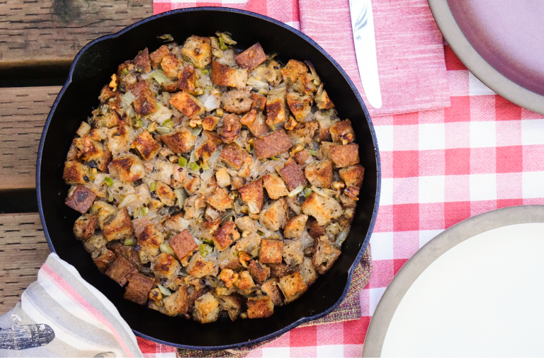 Spread the stuffing about an inch and a half thick into oiled baking pans or skillets, cover with foil, and bake at 350F for 45 minutes or so. Remove the foil and bake until the top is brown and crispy, about 15 minutes more.