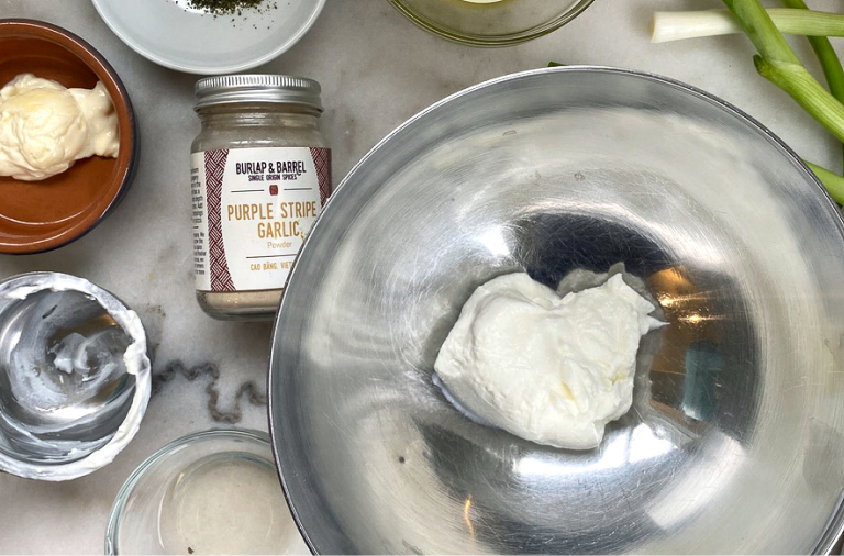 Mix in 2 tablespoons of mayo and about a cup of your favorite Greek-style yogurt.