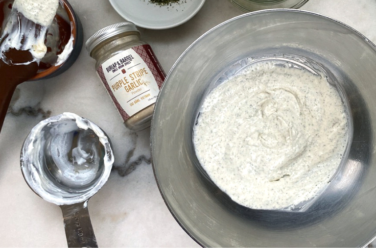 Stir in a teaspoon of purple stripe garlic powder, add 2 tablespoons of olive oil, and stir to emulsify.