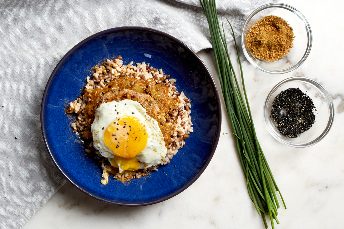 To serve, spread about a cup of the rice-barley mix on a plate. Place the meat patty on top, add some gravy, and if desired, top it all with fried egg. Sprinkle a pinch or two of togarashi or salty black sesame (or both) over everything.