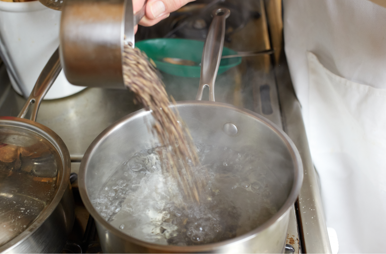 Cook uncovered at an active boil for 10 minutes, then add 3/4 cup of rice. Continue to cook uncovered at an active boil for another 35 minutes. Drain by slowly pouring off the water (or use a colander), fluff with a fork, cover, and rest for at least 10 minutes.
