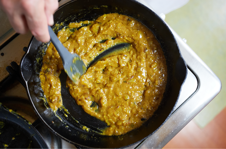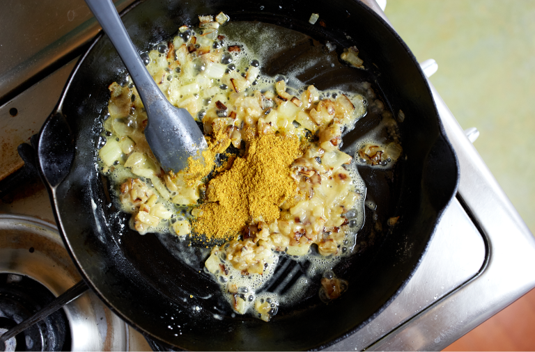 After cooking the onions and removing half, add an additional tablespoon of oil to make the roux. Stir in 1 tablespoon of curry powder. Cook for a minute or so, then add 2 tablespoons of flour and cook for a few minutes.