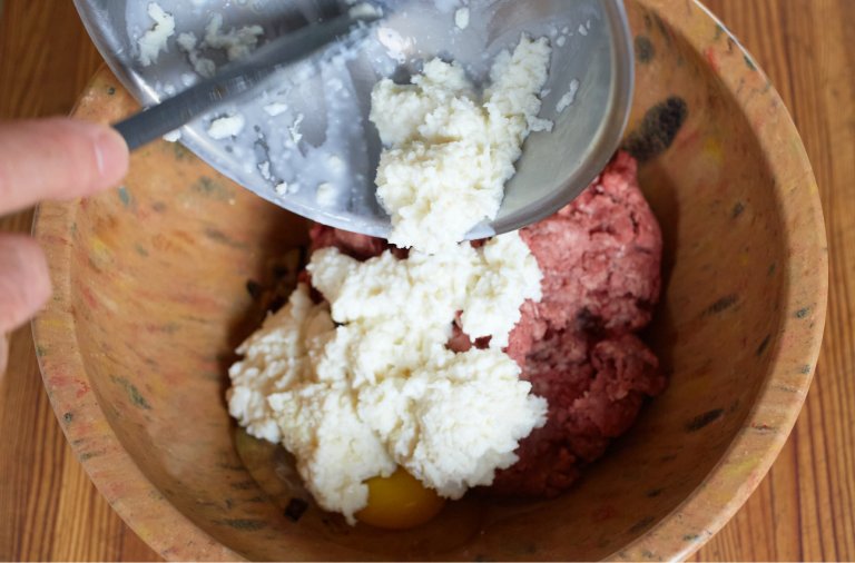 Combine the cooked onion, soaked breadcrumbs, ground beef, and 1 egg. Add a few pinches of sea salt and mix well.