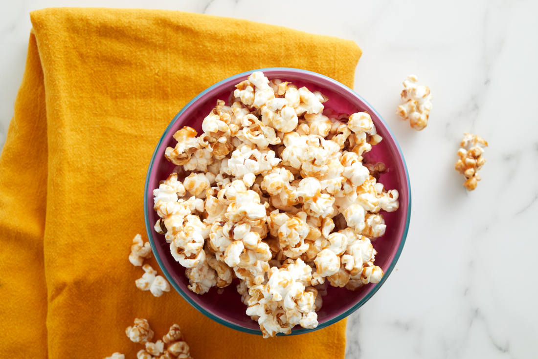 Boil for 3 minutes, then pour evenly over the popcorn. Immediately mix until evenly coated and sprinkle with a pinch of flake salt.