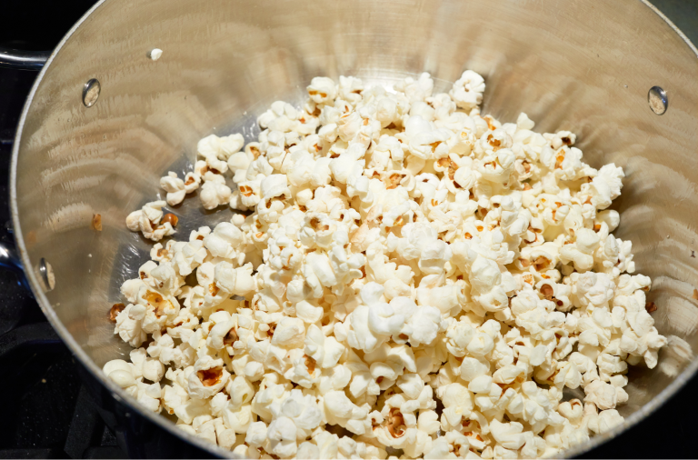 Heat up 2 tablespoons of olive oil in a large saucepan over medium-high heat, toss in a few corn kernels and cover with a lid (if you have one, splatter guards work great instead of a lid). Once the few kernels have popped add in the remaining kernels; cover and shake regularly throughout the popping process. Once popping has stopped, move the popcorn into a large bowl.