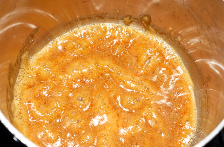 In a small saucepan add 4 tablespoons brown sugar, 2 tablespoons olive oil and 2 tablespoons honey. Over low-medium heat, slowly bring the mixture to a boil.