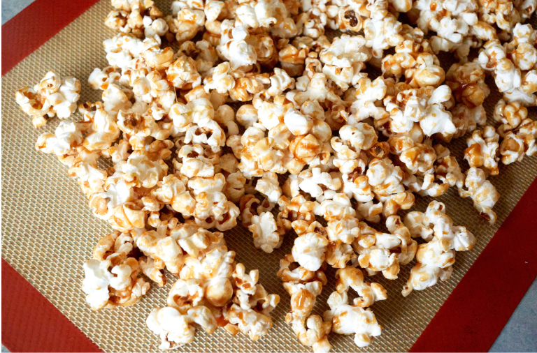 Place parchment paper (or a silpat) on your work surface and spread out the popcorn so it doesn’t stick into large clumps. Allow a few minutes for the popcorn to cool completely, and enjoy!