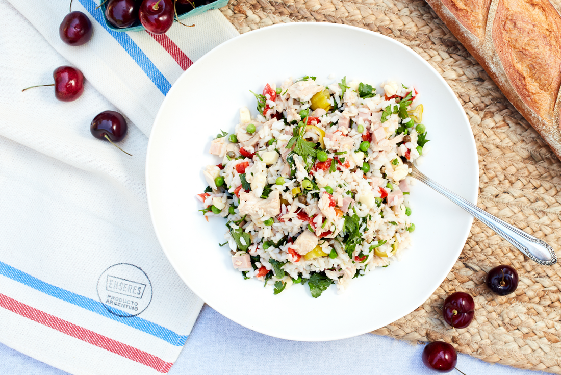 A classic insalata di riso always includes good canned tuna and some kind of cured pork product. While ham, aka prosciutto cotto in Italy, is the most common, fine-grained salume like mortadella or even hot dogs (called by their German name, würstel, in Italy) are perfect, too.